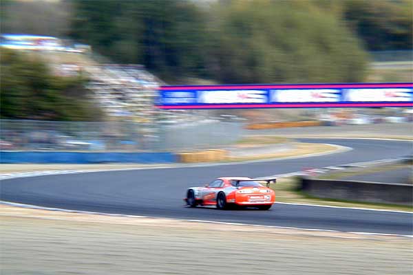 こんな全景なのです。1コーナー出口のスタンドが見えます。ここからはあまりいい写真が撮れないですね。TAKATA・NSXはピットアウトしてきたから奥(右ライン)に見えますが、普通はコーナリングのために手前(左側)からアプローチします。すると金網越しになっちゃうんですね。