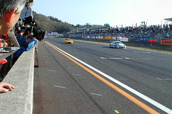 他のサーキットではなかなか立ち入れないホームストレートエンドで観戦することも出来るんですね。当然テレビクルーも撮影中です。