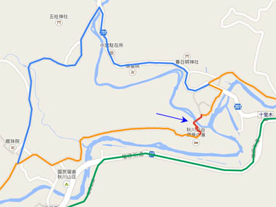 十里木まで桧原街道側道が右岸になる。そして十里木でいったん通りに出るのだが、右岸を行くのに舗装路を選ぶと、マップの青で書いた道を行かなければならない。この道は遠回りかつ、えらい登りになるのでショートカットするところを模索した。そして検討を重ね再度現地に赴き、赤で書いた「瀬音の湯」へアプローチする急歩行路がなんとか通れることを確認した。ただし狭いのでくれぐれも通行人の迷惑にならないようにするべし。