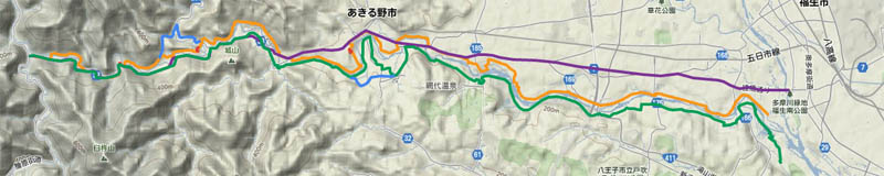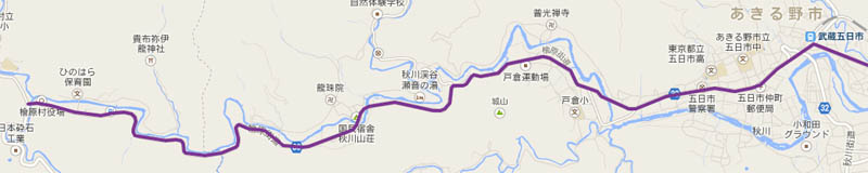 スタートポイントは福生南公園のゲート、ゴールポイントは桧原村役場そば橘橋T字路にしよう。ほとんどのかっこいい自転車にばっちり決めているウエアの方々はここを走っているのだ。ただし前半は二つ越える橋(新秋川橋と五日市橋)で川が見える以外は、単調に道路を走るだけである。街並みに趣があるわけでもなく、案の定私には向かなかった。