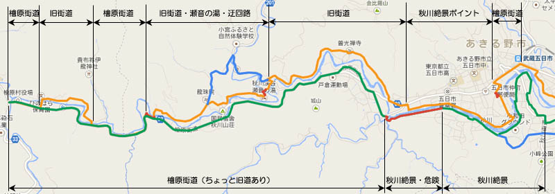せっかく清流な秋川を走るのであるのであれば、睦橋街道を走るべきではない。後半、武蔵五日市駅からの桧原街道はまだ許されるが、それでもわき道を行ったほうがはるかに面白い。ならば「なるべく川のそばを走ろう」を考えコースを選ぶ。
