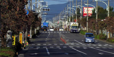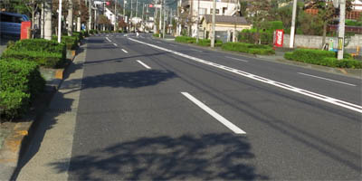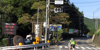 JR武蔵五日市駅を左折して桧原街道に入るが、ここに来て車道側の状況は一転する。広い通りを片側1車線しかレイアウトしていなく、歩道側には車も走れそうな幅広いエリアが確保されている。ここは自転車にとって非常に走りやすい、感動する道路レイアウトである。しかしその感動も「小中野信号」までの1.8kmで終了する。