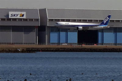 この日、このぎりぎりポイントからは国際線の到着便がよく見えた。ANAだ、見慣れているせいか、清楚なデザインがグッド。
