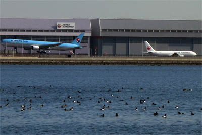 到着した大韓航空と出発前のJAL。JALは淡白すぎるけど、ブルーの大韓航空のデザインはあまり好きではないな。