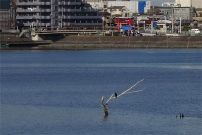 対岸には一般的に左岸のスタートポイントとなっている「弁天橋」の鳥居が見える。川の中間にはカワセミが大好きな止まり木があった。