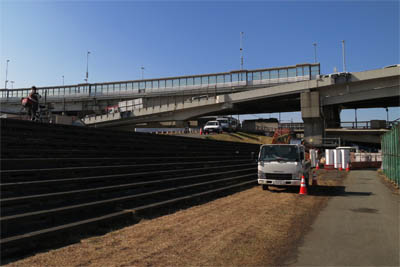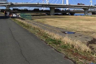 大河な多摩川を右手に見ながら土手上を快適に走れるのだが、2014年初頭は土手工事のため河川敷きの砂利道を走らなくてはならない。