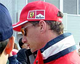 | 99年の決勝朝、パドッククラブ受付待ちにて遭遇 | シューマッハみたいにパーソナルスポンサーが許されなくて、シンプルな帽子だ | フェラーリに同化した赤ベースのヘルメットはアーバインが先なんだけどねぇ |