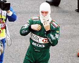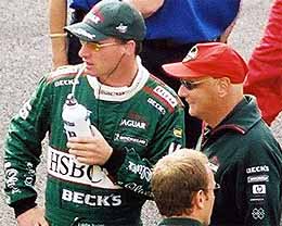 | 2000年、一転してジャガーに移籍。ヘルメットもあっと驚く「ジャガー」なのだ | フォードの血が入ったジャガーだけど、前身のスチュワートのときより成績悪く冴えない顔のアーバイン | ボビー・レイホールに追い出されるところだったところを救ったニキ・ラウダとツーショット |