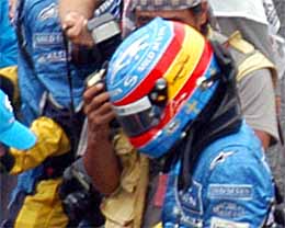 | 03年、立体交差下にコースアウトして「やっちまった!」状態です。アレジに似ていると思うのは私だけでしょうか? | このアングルなんてもろアレジですね。 | ファンに応えるアロンソ。口の下のちょび髭はやめなさいって! |