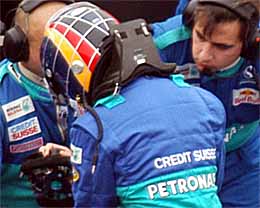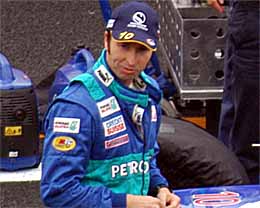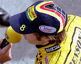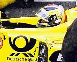 | 2003年のグリッドにて。もうF1引退が決まっていたのでしょう。さばさばしています。 | ヘルメットの後ろについているのはHANSで衝突時に頭が持っていかれるのを防ぐのです |