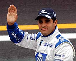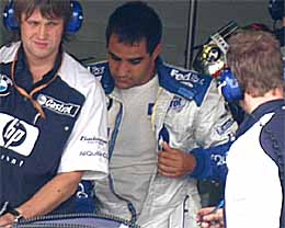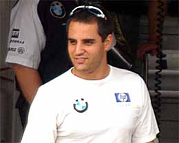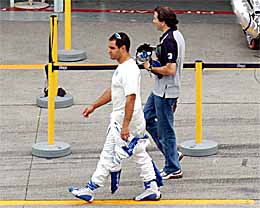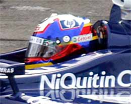 | いい顔ですねぇ、コロンビア人。でもマックが好きなだけあって、ちょっとポッチャリしています。 | いつのまにかクロームヘルメットになってしまいました。最近のF1では結構流行ってるんです。 | モントーヤはピットに戻るとすぐにスーツ脱ぐんですよ。 |