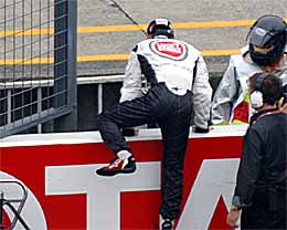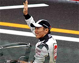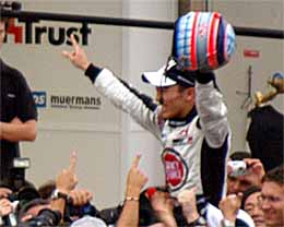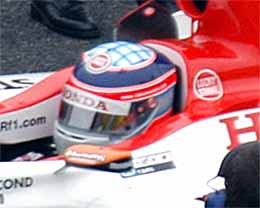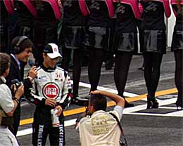 | 03年は浪人でテストドライバーだったのですが、日本グランプリではビルニューブが出場辞退したっていう状況で急遽参戦です。でもヘルメットのデザインは私としては×です。 | ドライバースパレードでうれしそうな図 | そしてもっとうれしそうな図 |