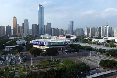 ◆さて景観。12階である。外に見えるのが運動競技場っぽい。「体育中心」とある。ニョキニョキが良く分かるね。ちなみにこれは2日目の夕方ちょっとだけ青空が見えた瞬間である。