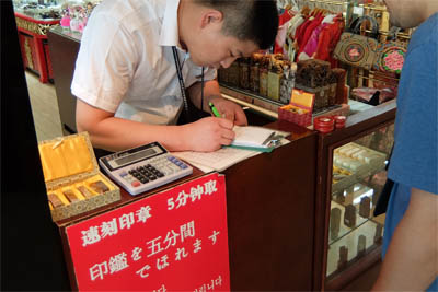 ◆で、何となく面白かったのが「印鑑つくります!」のところ。日本語で書いてあるぞ、5分だぞ、っていうことで同行氏が印鑑を作った。確かにいい感じの高級感ある石や象牙っぽいものがたくさんある。