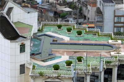◆隣のビル屋上にはプールがあった。夏なのに使っていない感バリバリである。