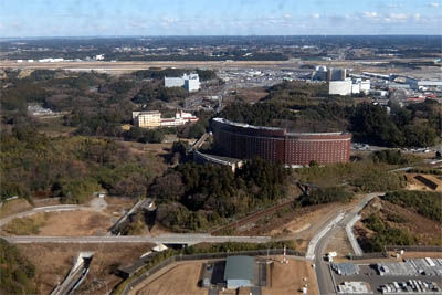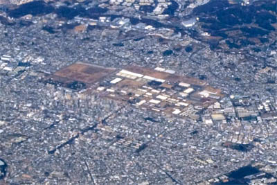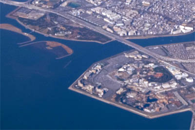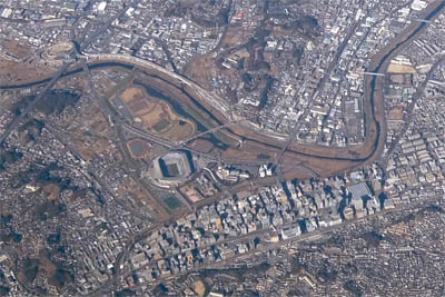 ◆幕張上空。千葉ロッテマリーンスタジアム(今はZOZOらしい)とその右に幕張メッセがみえる。まだまだ海岸拡張するのかなぁ?