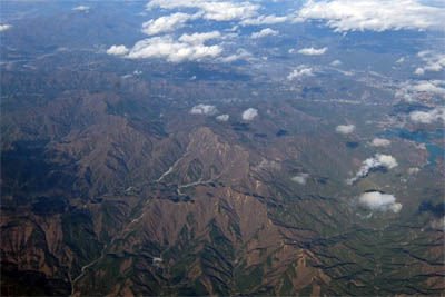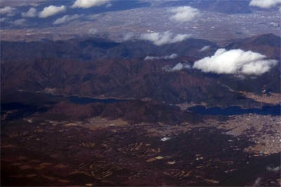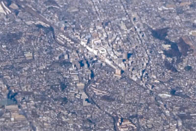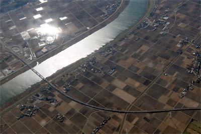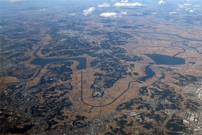 ◆北に向かって離陸したので、時計回りに旋回した。ちょうど旋回の内側窓だったので下が良く見えてよかった。川や池が反射して目がくらむ!