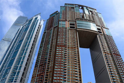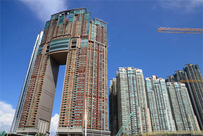 ◆柯士甸駅を出ると目の前に九龍の超高層ビルが見えた。