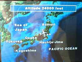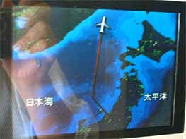 ◆さて15分くらいです。まだ日本の真上です。アジアの方面に行くときは、九十九里に出て東京の上を飛んで・・・って感じで面白いんですけどね。
