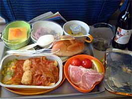 ◆1時間もたつともうお昼ご飯です。初めて飛行機に乗った頃は機内食ってとっても楽しみだったのですが、代わり映えがなく、味もぜんぜん・・・なんで、最近はどうでも良くなりました。残すことも多いです。ずーっと座りっぱなしじゃお腹もすかないしね。そういえば、初めて海外に行った新婚旅行で、パンってそのままかぶりつくのではなく、ちぎって食べるものって事がわかりました。