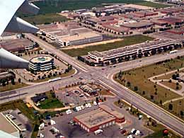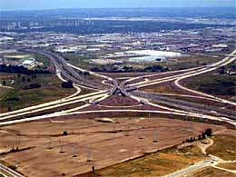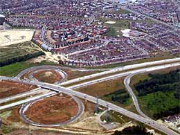 | うんうん、いかにもアメリカ系の町並みだ(どれがじゃ!) | 高速道路のインターチェンジ。万華鏡のようにも見えるぞ。 | 家も密集しています。パッツンパッツンって感じですな。 |