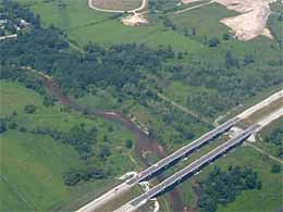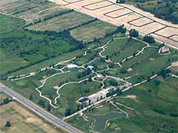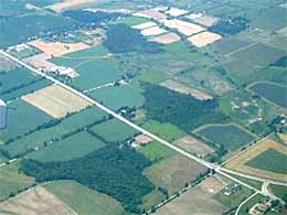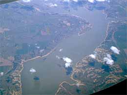 | 川の上の橋 | 何でしょう?ゴルフコース?空から見ると以外に面白い模様なのです。 | もう少し上昇すると、緑きれいな農村?地帯に突入だ |