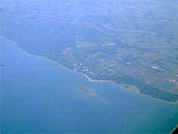 | 道路の区画もきっちりきっちり | と言っていたら海?に出ました。でも海じゃないですね。まだ20分しかたっていませんから。五大湖のヒューロン湖かスペリオール湖でしょう。 | ちょっと瀬戸内のようです |