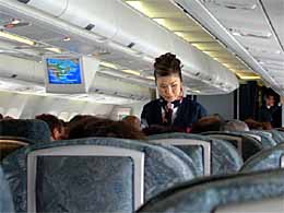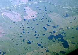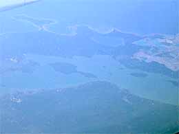 | 30分も経つとスチュワーデスさんが配り物をしてくれます。でも席が狭いのがよく分かるなぁ。 | あれ?小さい池?がたくさんあるなぁ?と思ったら、雲の影でした | こちらはちょっと色が悪い湖ですね。 |