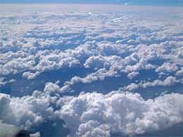 | 今回はJALです。正規チケットなので2階席をゲットできました。当然窓側です。今回は左側です。つまりヨーロッパに向かっていく飛行機の南側を見ることになります。 | 日本海を抜けてロシア大陸へ突入するところです。季節は夏の終わりなので雪一つ無いですねぇ。 | 雲を見ているのもまた楽しいのです。雲を見下げることってあまり無いですからね。それに雲ってその形や並びが、なぜか心に響くのですよ。 |