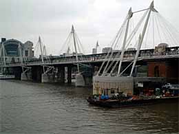 | 橋の中央から。左がロンドンアイ、右がのお国かすかに見えるとんがりがビックベンです。 | この橋の説明がありました。2000年プロジェクトで作ったんですね。 | 吊り上げ方がちょっと珍しい感じですが、まああまりたいしたもんでもないですね。 |