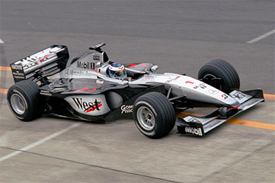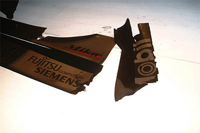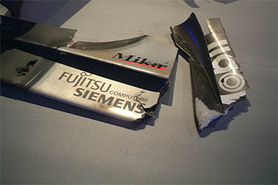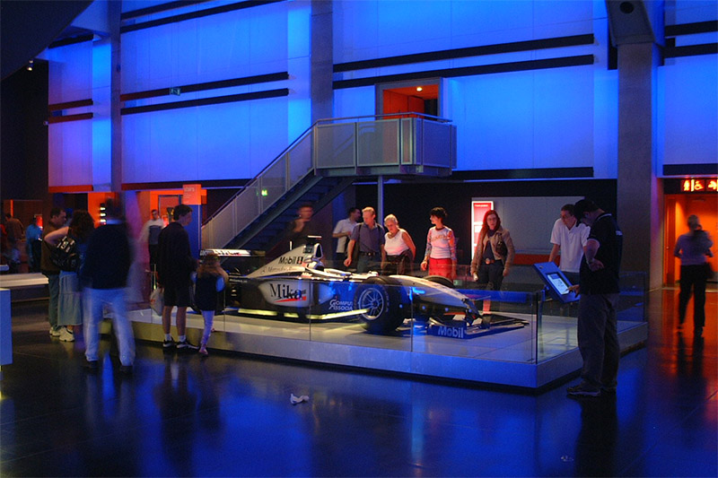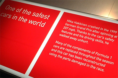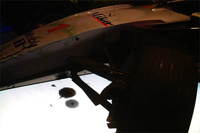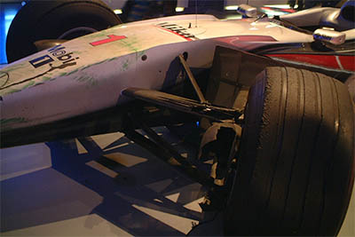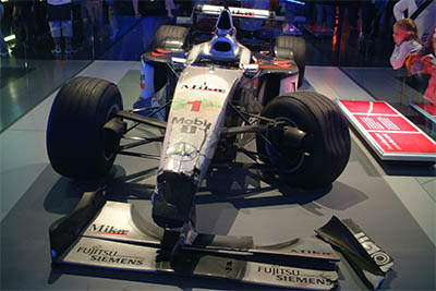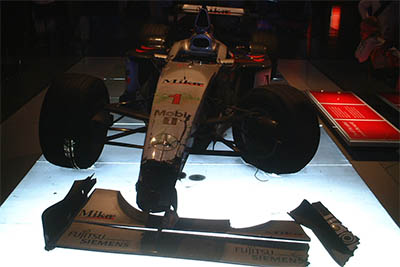 科学博物館を見ているのは飽きません。なのでじっくり見ていました。そしてフロアを上がってみると、なんか奥のほうにF1があるではないですか。おお、F1F1と興味津々に近づいて行ったわけです。しかし何かおかしい。なんかちょっと傾いているじゃん、タイヤも空気が抜けかけているじゃん・・・ってことで、イギリスの科学博物館ってこんなに管理悪いんだ、と結構幻滅したわけで。でも近づいてみると・・・