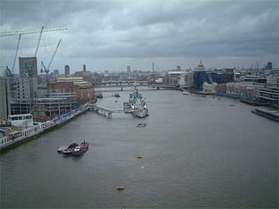 | 【#125】 テムズ川の下流(東)側です。激天気悪いです。 | 【#126】 テムズ川の上流です。奥にロンドンブリッジが見えます。向かって左側を歩いてきました。けど、このあと係員が来て「降りてチョーダイ」と強制退去させられました。でも塔内部にある昔ながらの石階段を延々と下りるなんて、めったに経験できるもんではありません。まあそれはそれでヨカッタ! |