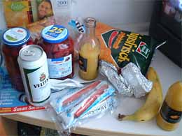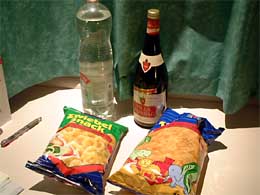 | 【#465】ワインやビールは”VELTINS”です。なぜこれをチョイスかといえば、相変わらずのF1がらみです。ウイリアムズのスポンサーになっていたりするからですね。 | 【#466】水やら他のワイン、あとお気に入りのスナック菓子も買ってきました。 | 【#467】こんな具合にちびちびやっているのです |