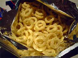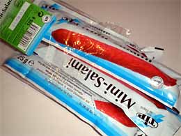 | 【#468】大好きなスナック菓子ですが、食べた瞬間に参りました。しょっぱすぎ! | 【#469】そして”サラミを食べながら”っていう相変わらずのイメージ優先で買ったものですが、もっと参りました。しょっぱすぎ! ドイツ人は皆高血圧で病気になちゃうぞ。 | 【#470】ビン詰めはKさんおすすめのプラムの瓶詰めです。ビールはVELTINS、バナナとアルミラップに包んであるのは後から出てきますが、ドイツの父母からの差し入れです。 |