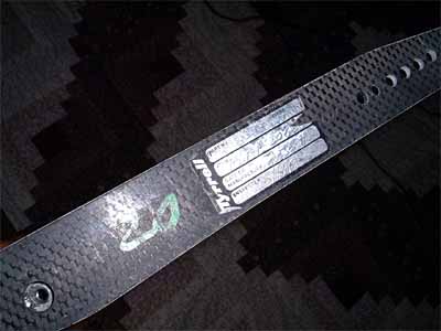 | 唯一のスポンサーマークはGOOD・YEARです。もちろんステッカーです。実際に使われていたっぽいのはうれしい限り。 | 前端です。このポチポチは走行でついた傷って言うより、カーボンの地が塗装で埋まりきらなかったって感じですね。やっぱ弱小チームの品質レベルなのかなぁ? |