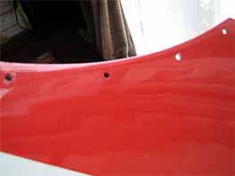 | これがその孔の拡大。前側2個と後ろ側1個が使われていたようですね。 | 前側2個の拡大。しっかり締め付けられて、塗装分のところがへこんでいるんですねぇ。このいかにも「使ってました感」がいいですねぇ。 | さてその孔を翼端版側から見たところ。カーボン剥き出しです。萌えます。 |