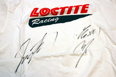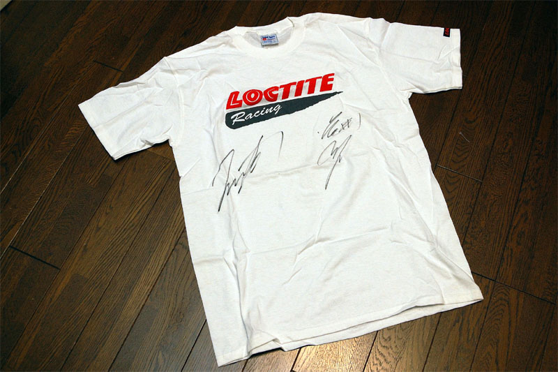 ロックタイトがモータースポーツに気合入りまくっていた2000年前半、サーキットに招待されるとTシャツがもらえました。いろいろな営業さんと仲良くなりたくさんもらっちゃいました。これは2001年開幕戦の岡山TI英田サーキットに呼んでもらったとき、営業さんに「これドライバーのサイン入りTシャツです」といってもらったものです。道上・光貞両選手のサインですね。