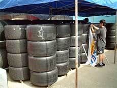 [右]:こんなにタイヤあるなら1本くらいちょうだい!・・・ニスモのピット裏