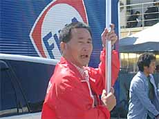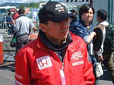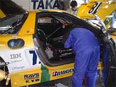 パドック内に光貞/道上の両No.1カードライバーとか、セバスチャン(TAKATA NSKのドライバー・・・なんとなくセナの若い頃に似ている・・・)とか、童夢の林みのる社長とか、無限監督の熊谷さんとか、そこいらじゅうにいるわけです。ドライバーの奥さんと思しき女性はさすがにレースクイーン並です。うらやましいぞ(じつはレースクイーンだったらしいです。後日判明)