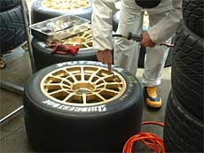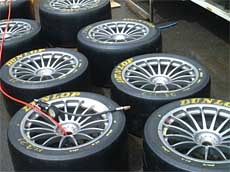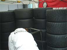 [左]:雨が振るとガレージの裏はレインタイヤとスリックタイヤの置き場所でもうタイヤの壁状態です