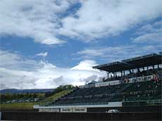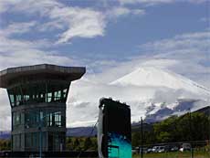 [中]:ピットからグランドスタンドの左端に富士山が顔を覗かせました。