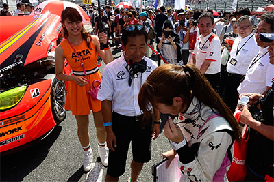 ◇女子リポーターをいじっているな。井澤エイミーさんは耐火スーツを着てもナイスでかわいいぞ。地上波でも出てほしい・・・。実は後ろに写っているのは、F1でもおなじみなブリヂストンモータスポーツ部長の安川さんだ。浜島さんの上司だった人だぞ。