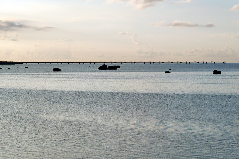 自転車で景観をきょろきょろ見ながらゆっくり走って20分。佐和田の浜に着いたのは18時20分、日の入りまであと20分だ。正直って普通の浜であった。白い砂が広がっているわけではない。サンゴが砕け小貝殻的になった浜である。しかし沖には宮古島の有名スポットである下地島空港への誘導橋が良く見えるし、海には岩がゴロゴロしている。夕陽が沈むまでぼーっと海を眺めていた。とってもリッチな時間だった。