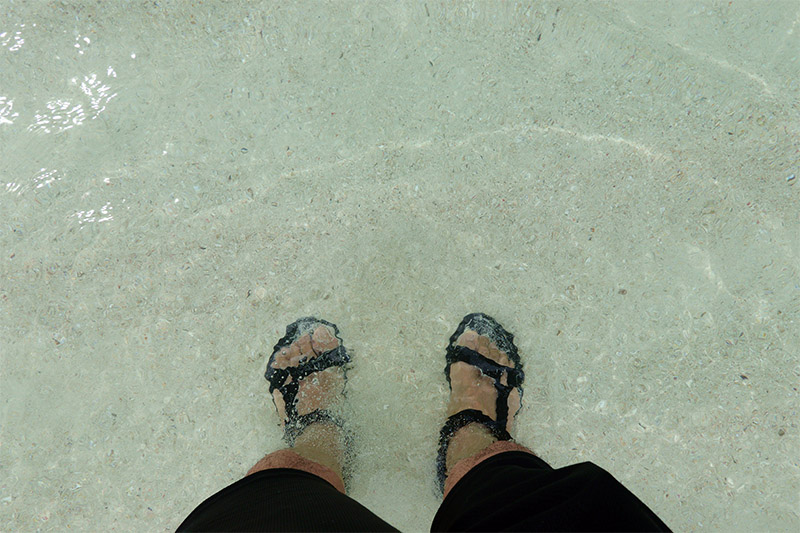 地図は頭に入っている。でも今度はチャリでアプローチなので近回りができる。滑走路の東側から入って行けば、チャリなら短時間で17ENDまで行けてしまう。これだぜこれ。滑走路の横、右側に佐和田の浜を見ながら17ENDに向かう。小雨はもう慣れっこなので、カッパも傘も必要ない。そしてさっき待機していた飛行機はそのままの状態だった。小雨だし飛行機は飛ばないしで、人がほとんどいない。つまりプライベートビーチ状態。ってことでほんの少ししかない「白浜」に降り、海に入ってみた。すげー透明だ!