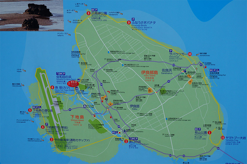 ■さらに進むと、小さなビューポイント的な駐車場があった。場所は下の観光地図の「現在位置」。17ENDの誘導路を遠目に、浜にある岩群を撮れるところ。