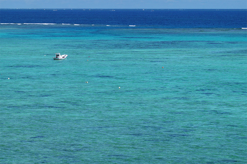 ■もっと海のほうを見ると、さっきの船がまだ留まっていた。いいアクセントだし、サンゴ礁の先が如実に色が変わるのがわかりますな。