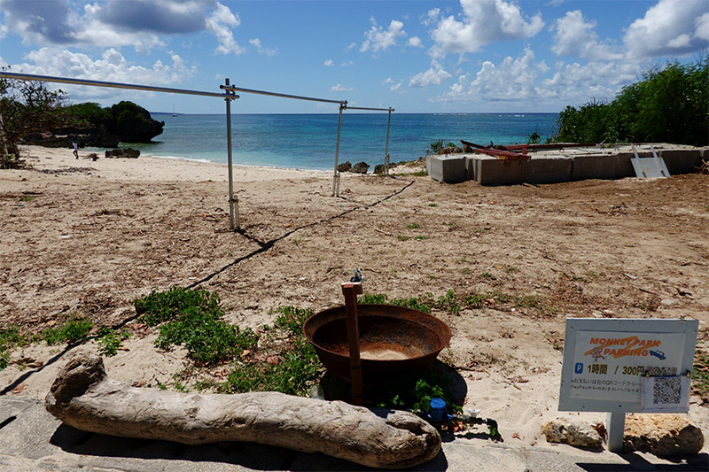 ■灯台を過ぎるとあとは下り坂。チャリにとって下り坂は最高なのである。しばらく行くと、建物がちらほら出てきたが、右下の看板に「1時間300円」とか書いてあるじゃん。高すぎないか?まあ車でこの浜に来たら停めるしかないか・・・