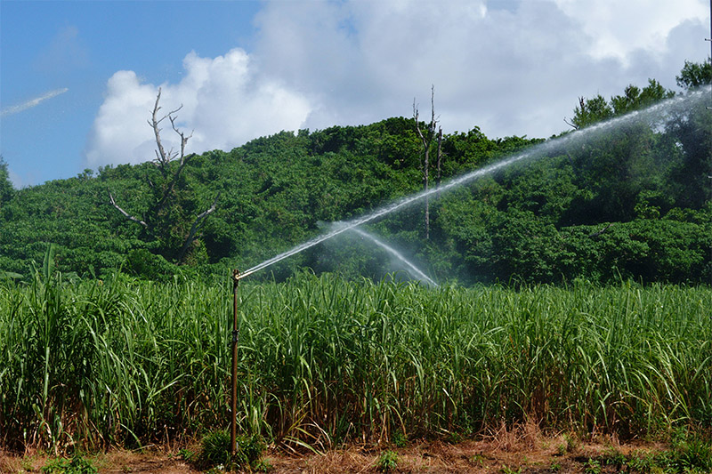 ■どこを見てもサトウキビだらけ。スプリンクラーが力強く水を吐き出しているのだよね。