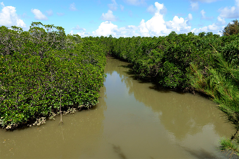 マングローブ公園を出ると、再び単調なサトウキビ畑の中の広い道路をひたすら進む。暑いし日影がないし微妙な坂でだいぶめげる。めげたからどうなるというものでもないので、ペダルをこぐしかない。下の地図がそのルートだけど、今思えば、少し海側に行ってもよかったかな?