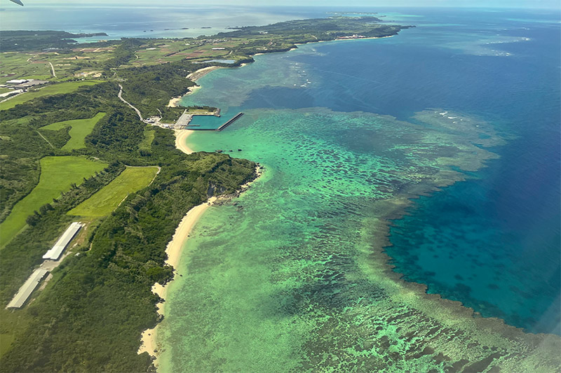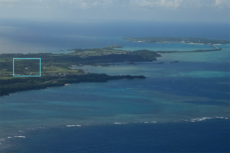 ■そこで行きの飛行機、窓から見えた池間島方面の写真EXIFを見てみると時間は14時26分。おっ、同じ飛行機だな。その時の写真がこれ。四角で囲んだあたりがマングローブ公園である。ちょっと飛んだ位置が違うような気がする。ちなみに池間大橋に向かう細い砂州みたいなところが良くわかるね。